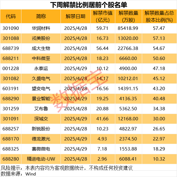 据数据宝统计,下周(4月28日至30日),将有超40股迎来限售股解禁,以个股最新价计算,解禁股对应市值合计逾400亿元。