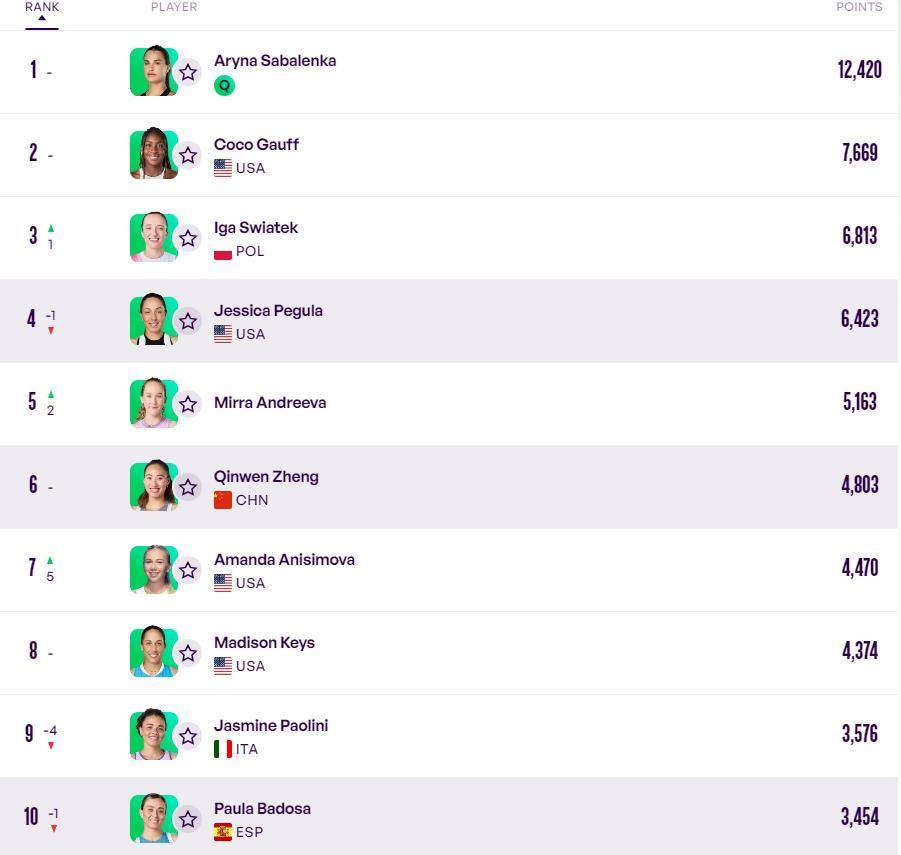 中国金花郑钦文以4803分位于第6位,排名较温网前小降一位;米拉·安德列娃跃升至第5位,比郑钦文多360分;在温网获得亚军的阿尼西莫娃以4470分位于第7位,比郑钦文落后333分。
