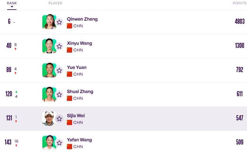 其他中国金花中,王欣瑜位列第40位,袁悦在第89位,她们与郑钦文一起处于Top100区间。老将张帅的单打排名在120位,韦思佳第131位,王雅繁第143位,总体上来说,距离去年的中国女网小高峰,尚有距离。