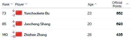 中国男网在本赛季深陷伤痛困扰,目前,位于Top100的只有布云朝克特和商竣程。前“中国一哥”张之臻已经滑到第140位,吴易昺则在259位。在本赛季的国际赛场上,多数时候只有布云朝克特一人孤身奋战。这样的状况让中国球迷们实在揪心,期待商竣程、张之臻等都能顺利康复,重新回到巡回赛中。
